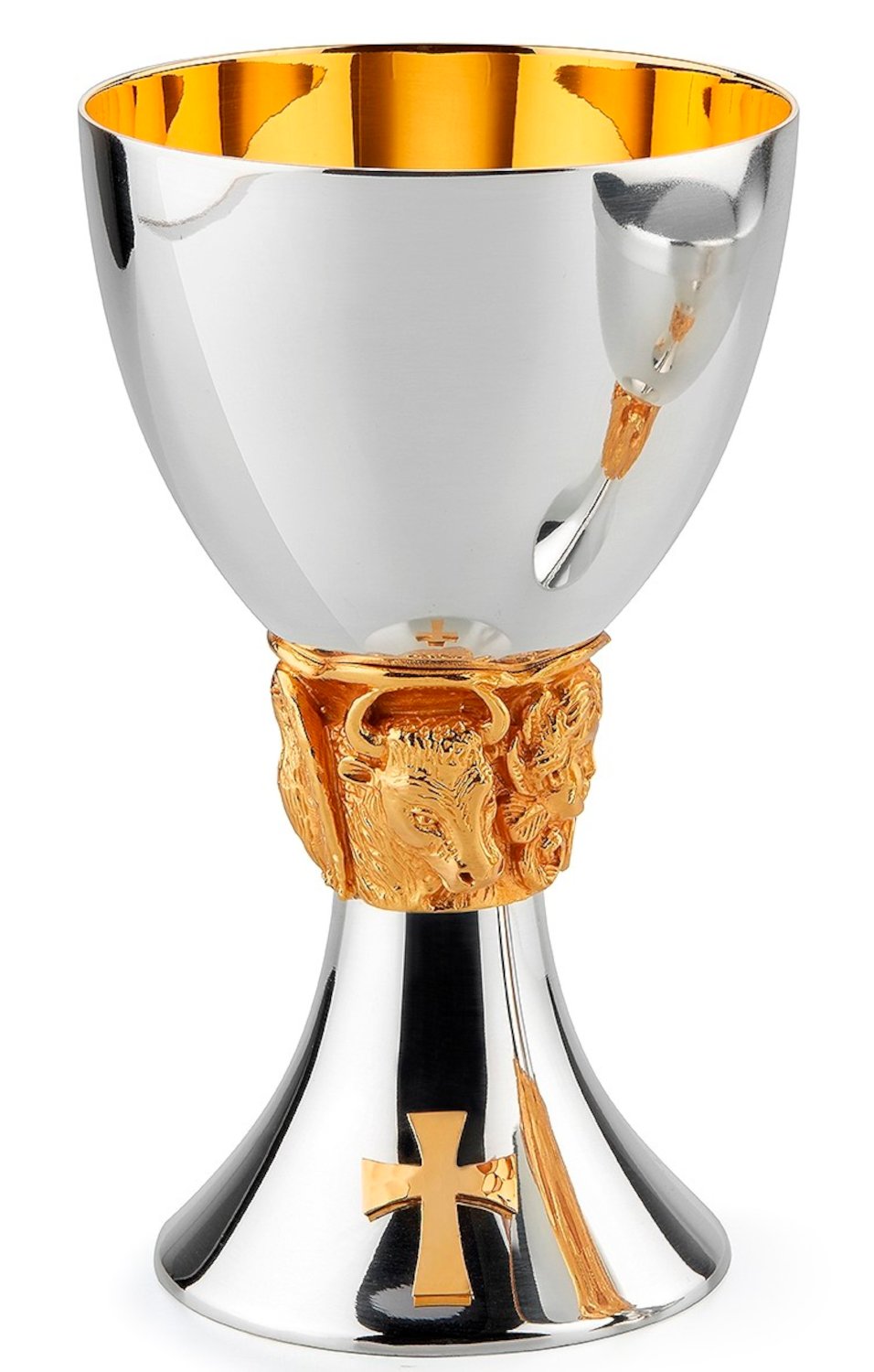 Kelch aus Messing, außen versilbert und poliert, Nodus vergoldet, mit der Darstellung der 4 Evangelisten, Höhe: 17,5 cm, Cupadurchmesser: 10,4 cm