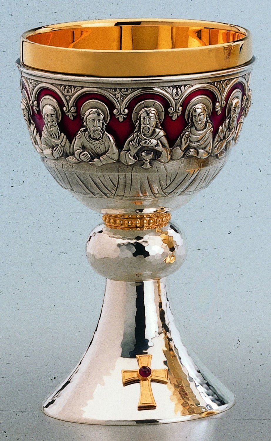 Kelch aus Messing, außen versilbert, Ziselierarbeit auf Email auf der Cupa, Darstellung des Letzten Abendmahls, Nodus und Kelchfuß gehämmert, ein Kreuz ist auf der Kelchbasis angebracht. Dem Kelch ist eine Patene mit einem Durchmesser von 15 cm beigefügt. Kelchhöhe: 18 cm, Cupadurchmesser: 11 cm