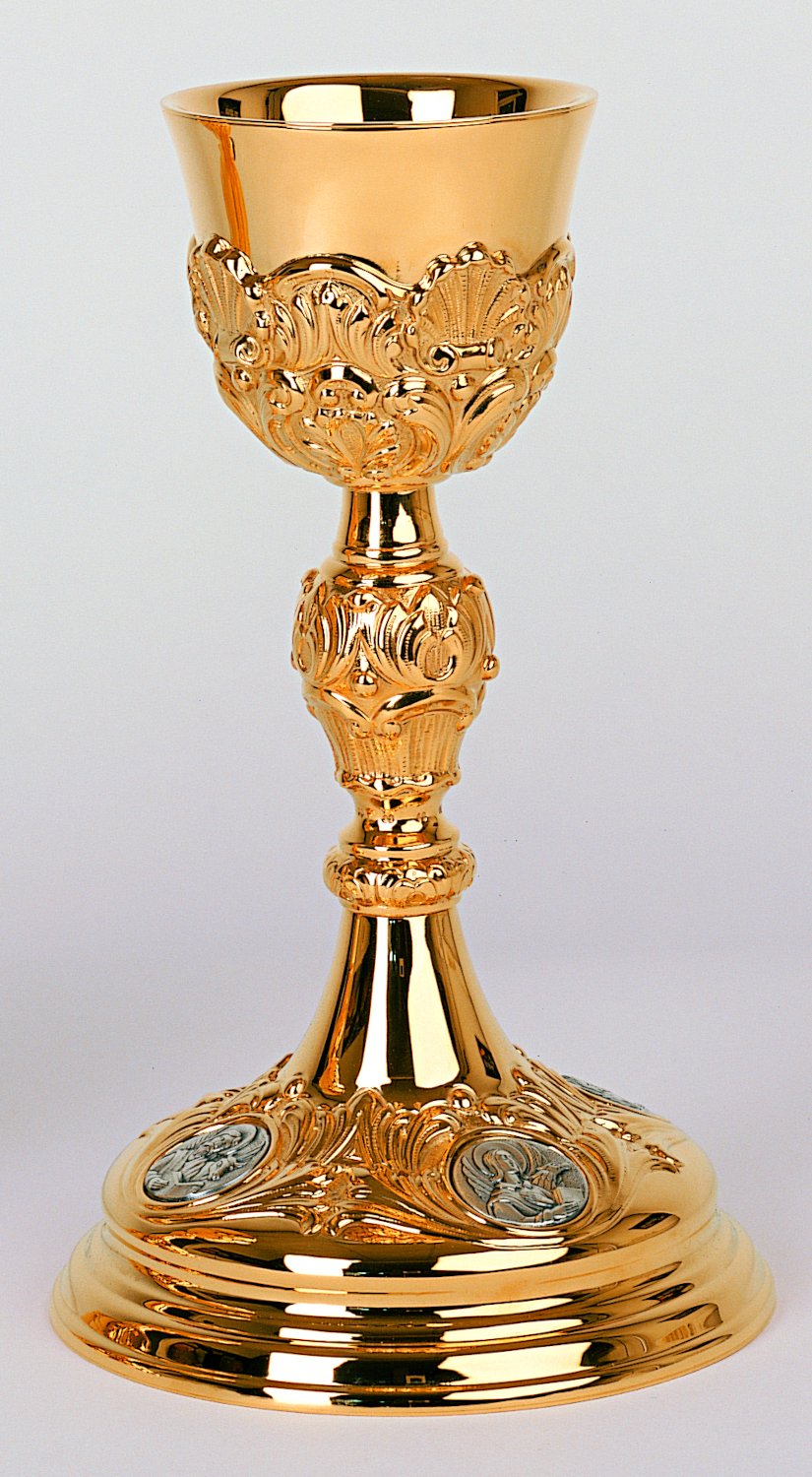 Kelch aus Messing, vergoldet, reiche florale Ziselierarbeit über den gesamten Kelch. Am Klechfuß befinden sich 4 Medallions mit den Darstellungen der 4 Evangelisten. Höhe: 25 cm, Cupadurchmesser: 9 cm. Dem Kelch ist eine Patene beigefügt