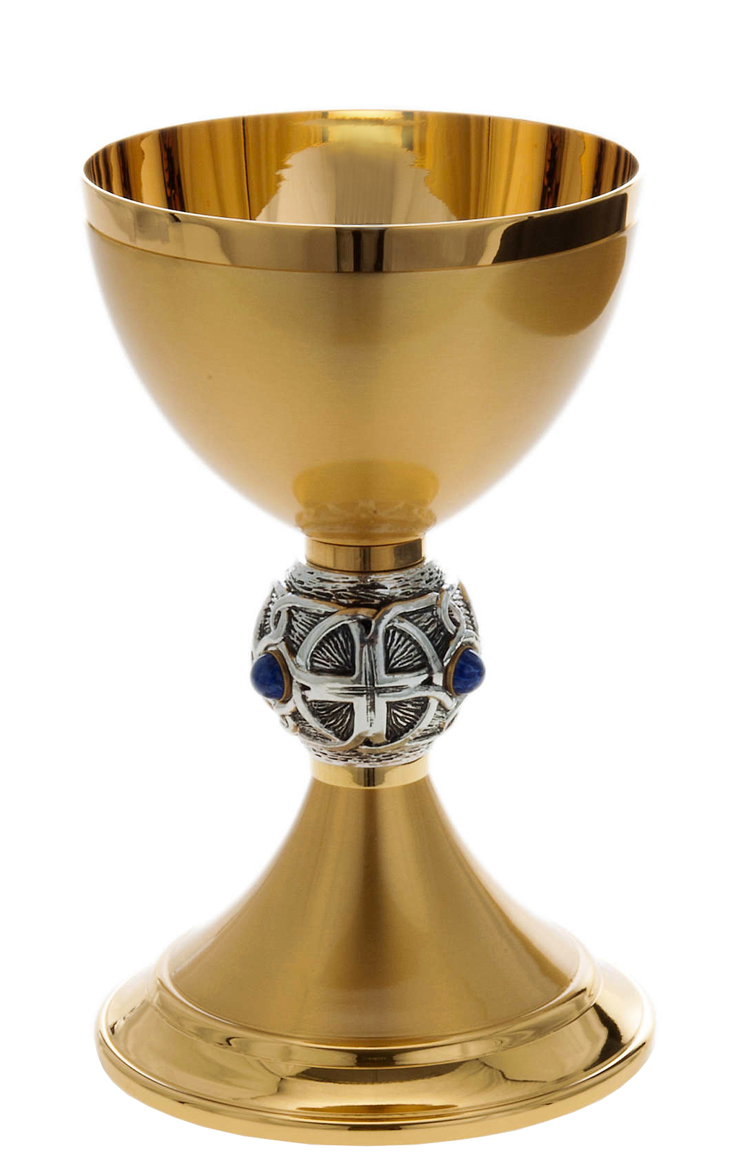 Kelch aus Messing, vergoldet mattiert, Ringe um Cupa und am Fuß poliert, Nodus versilbert mit Kreuzsymbolen und blauen Steinen, Kelchhöhe: 20 cm