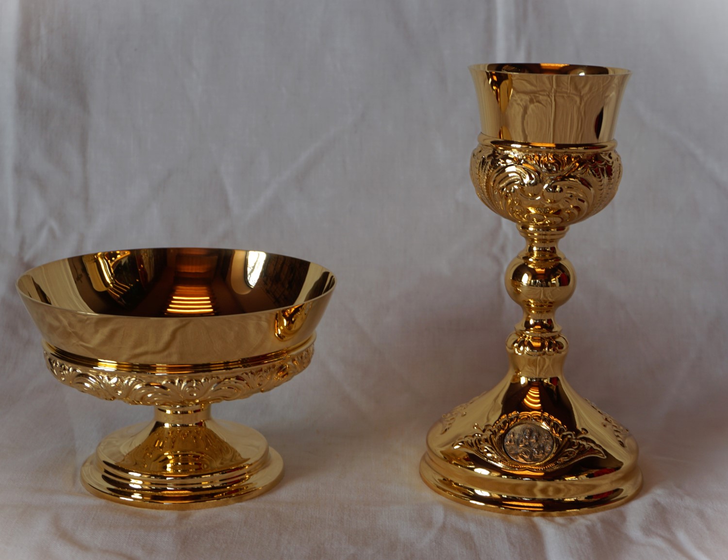 Die ebenfalls dargestsellte Hostienschale sowie die Kelchpatene passen zum Kelch, sind aber im Kelchpreis nicht enthalten (finden Sie dafür mehr Details unter MO5042).