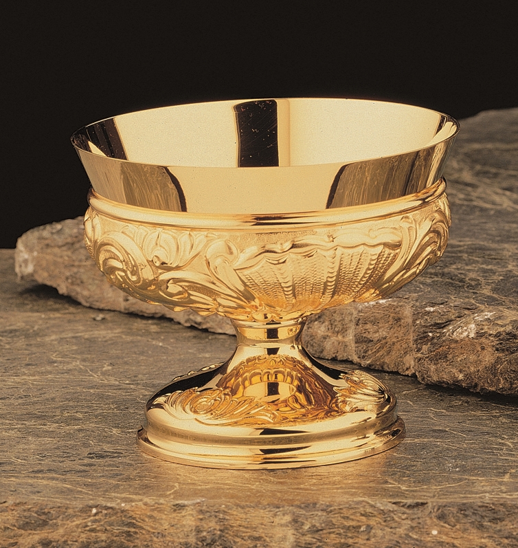 Kelch mit florale Ornamentik auf dem Cupafang und auf dem Fuß, auf der Basis Darstellungen der Heiligen Familie in Medallionform. Kelchhöhe: 23 cm, Cupadurchmesser: 8 cm. Diesen Kelch gibt es in 2 Ausführungen: 1.: die Cupa ist, wie der übrige Kelch, aus Messing und vergoldet oder 2.: die Cupa ist aus Sterling Silver und vergoldet. Bitte wählen Sie aus!