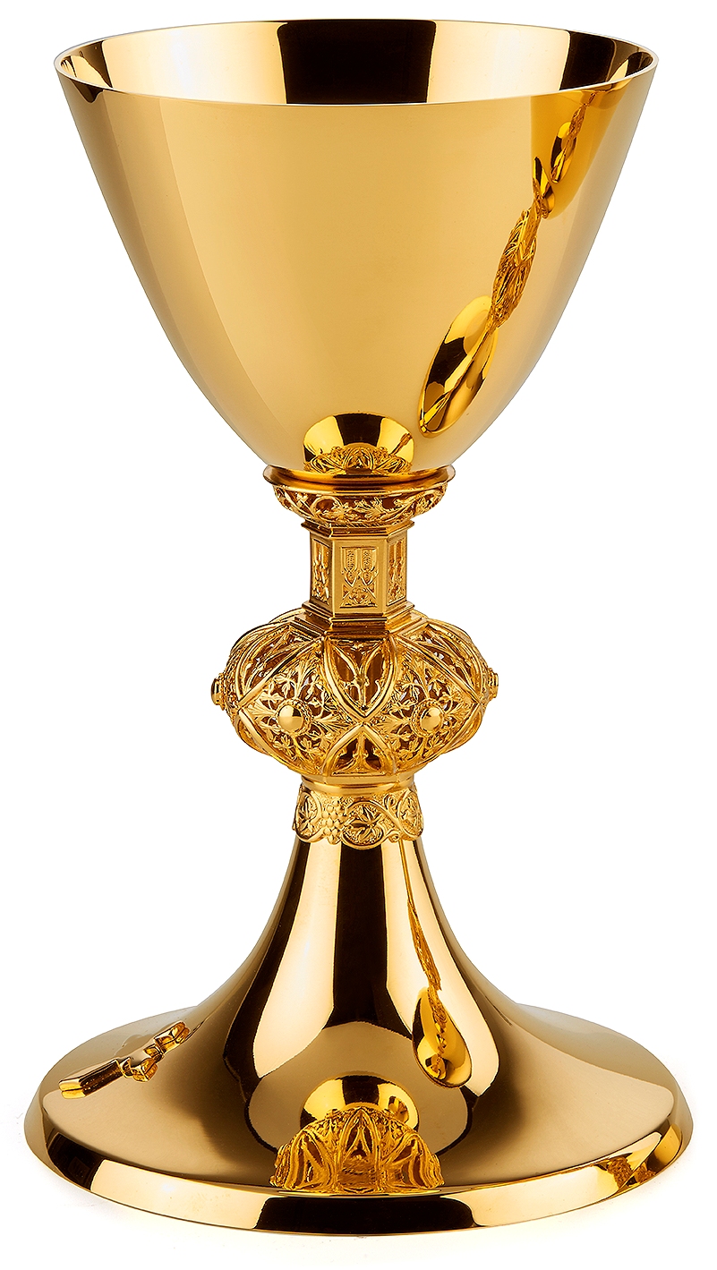 Kelch aus Messing, vergoldet, ausgiebige Ziselierarbeit am und um den Nodus, Höhe: 21 cm, Cupadurchmesser: 11,34 cm