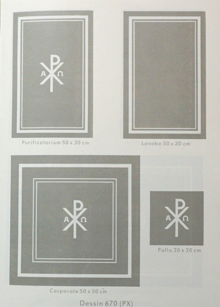 Reinleinenkelchwäsche mit eingewobenem Motiv: PAX, Dimensionen: Palla: 17 x 17 cm, Purificatorium: 50 x 30 cm, Corporale: 50 x 50 cm, Lavabo: 50 x 30 cm, die Palleneinlage ist einfach aus der Leinenhülle zwecks Waschens herauszunehmen. Sie können gerne die einzelnen Teile bestellen aber auch das Set aus den 4 Teilen