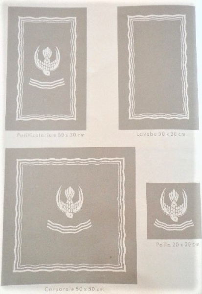 Reinleinenkelchwäsche mit eingewobenem Motiv: "Heilger Geist", Dimensionen: Palla: 17 x 17 cm, Purificatorium: 50 x 30 cm, Corporale: 50 x 50 cm, Lavabo: 50 x 30 cm, die Palleneinlage ist einfach aus der Leinenhülle zwecks Waschens herauszunehmen. Sie können gerne die einzelnen Teile bestellen aber auch das Set aus den 4 Teilen