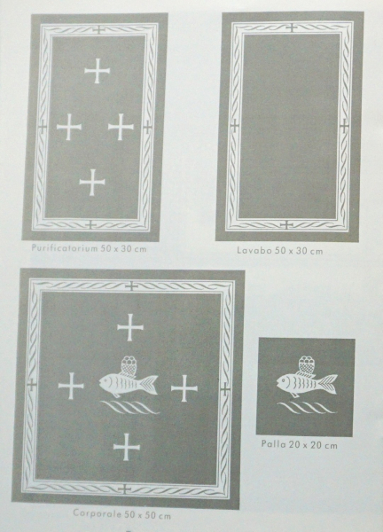 Reinleinenkelchwäsche mit eingewobenem Motiv: Fisch, Dimensionen: Palla: 17 x 17 cm, Purificatorium: 50 x 30 cm, Corporale: 50 x 50 cm, Lavabo: 50 x 30 cm, die Palleneinlage ist einfach aus der Leinenhülle zwecks Waschens herauszunehmen. Sie können gerne die einzelnen Teile bestellen aber auch das Set aus den 4 Teilen