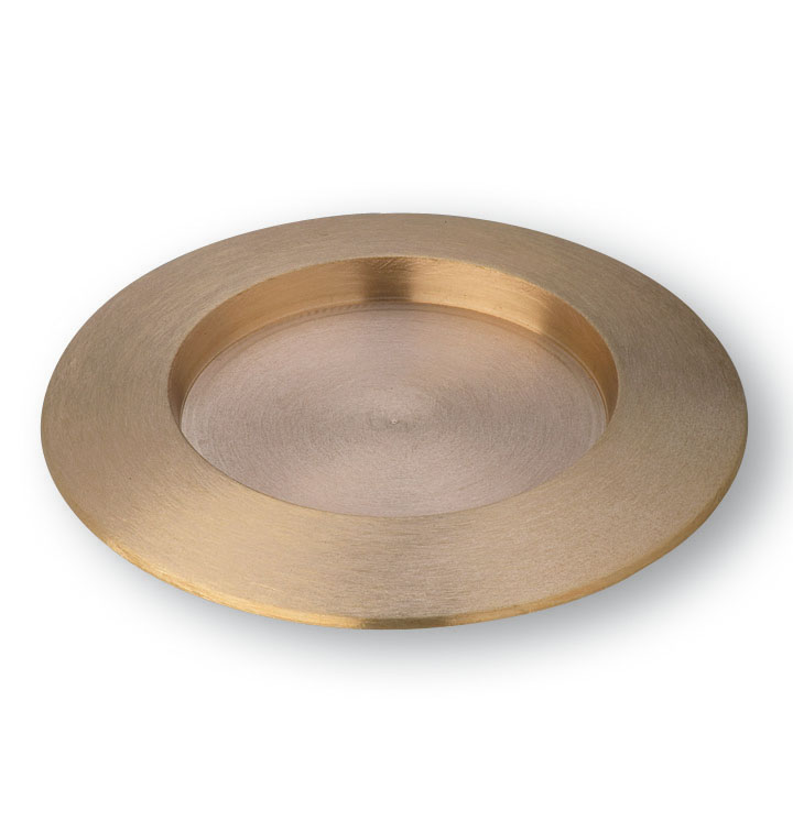 Der Messingleuchter hat einen Außendurchmesser von ca 12 cm, einen Innendurchmesser für die Kerzen von 7 cm sowie eine Höhe von 1,8 cm. Die Oberfläche ist gebürstet.
