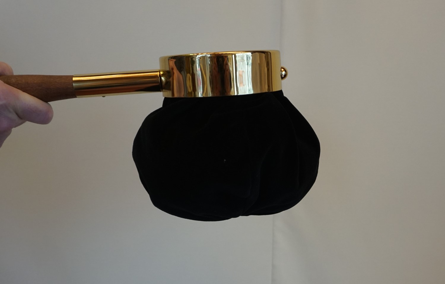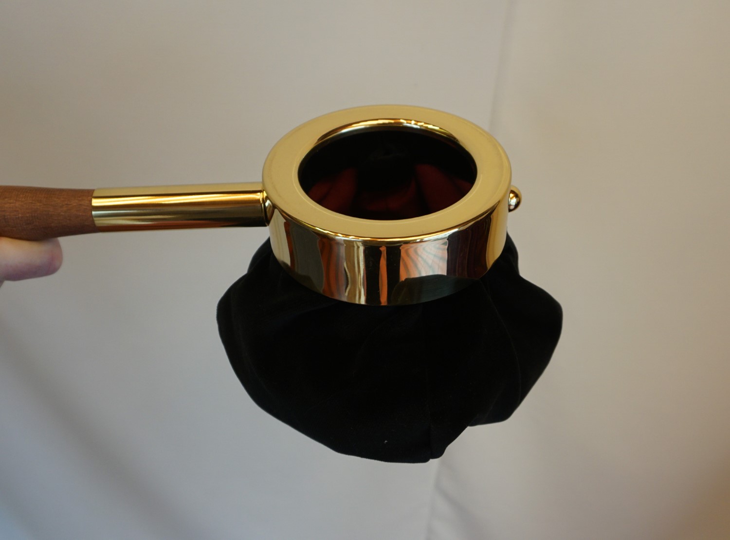 Klingelbeutel mit Öffnungsdurchmesser von 11 cm, 1 Griff, Metallteile aus poliertem Messing, aus 4 Teilen vernäht, schwarzer Samt, Innenfutter