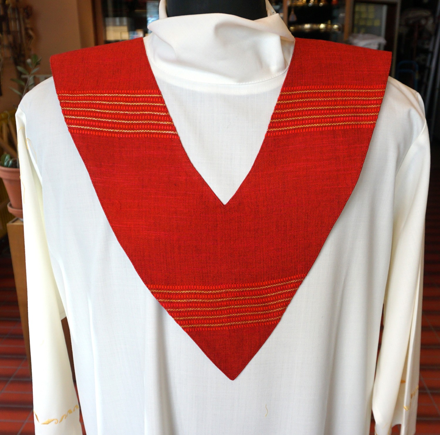 roter Kragen für Lektorinnen und Lektoren, mit eingewobenen Goldlurexfäden, Material: Schurwolle/Trevira Gemisch, Breite ca 12 cm