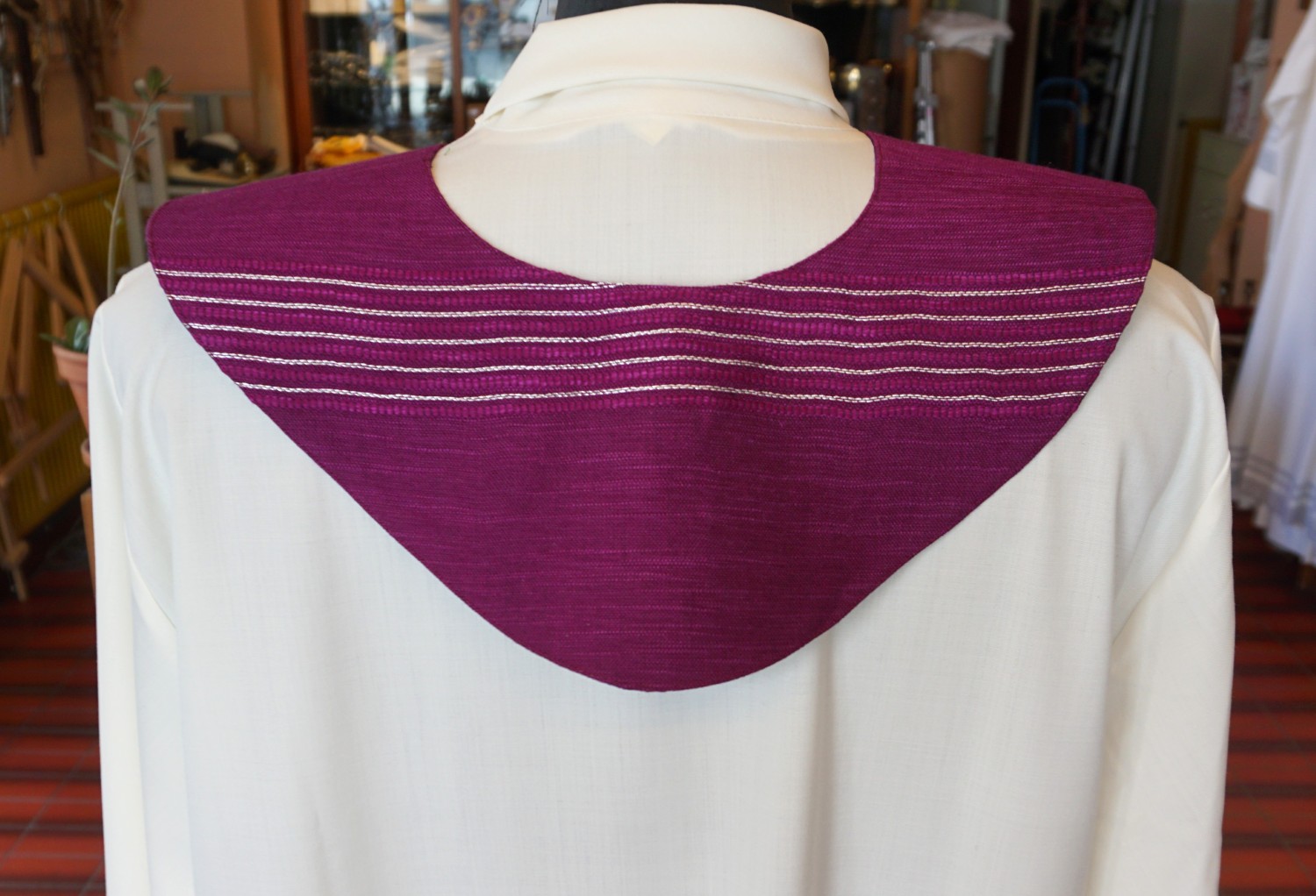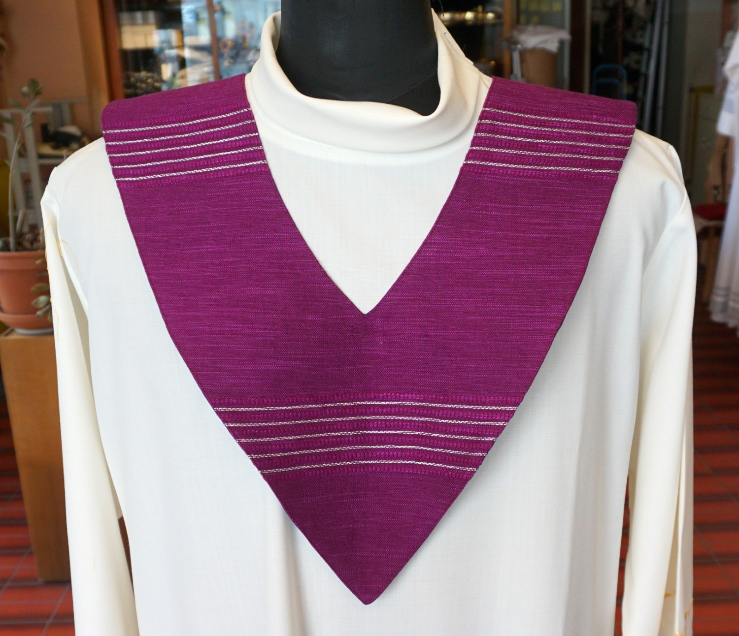 Kragen für Gottesdienstleiterinnen und Leiter in violett. Quergezogen sind eingewobene Lurexsilberstreifen, Kragenbreite: ca 12 cm