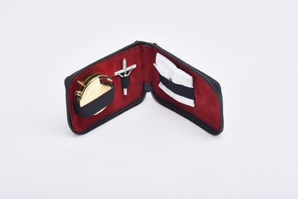 Etui aus Kunstleder, Inhalt: Hostiendose, Kreuz und kleines Corporale, Abmessung: 9 x 11 x 2 cm, Zippverschluß