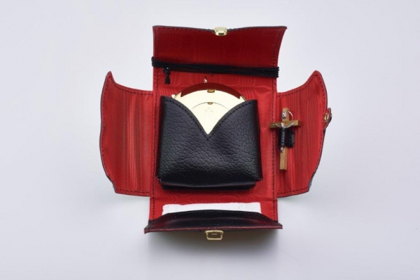 Etui bestehend aus 3 Inhaltsteilen: Hostiendose, Kreuz, kleines Coporale, Kunstlederetui zum Umhängen, Maße: 11 x 11 x 4 cm, Pyxisdurchmesser: 9 cm