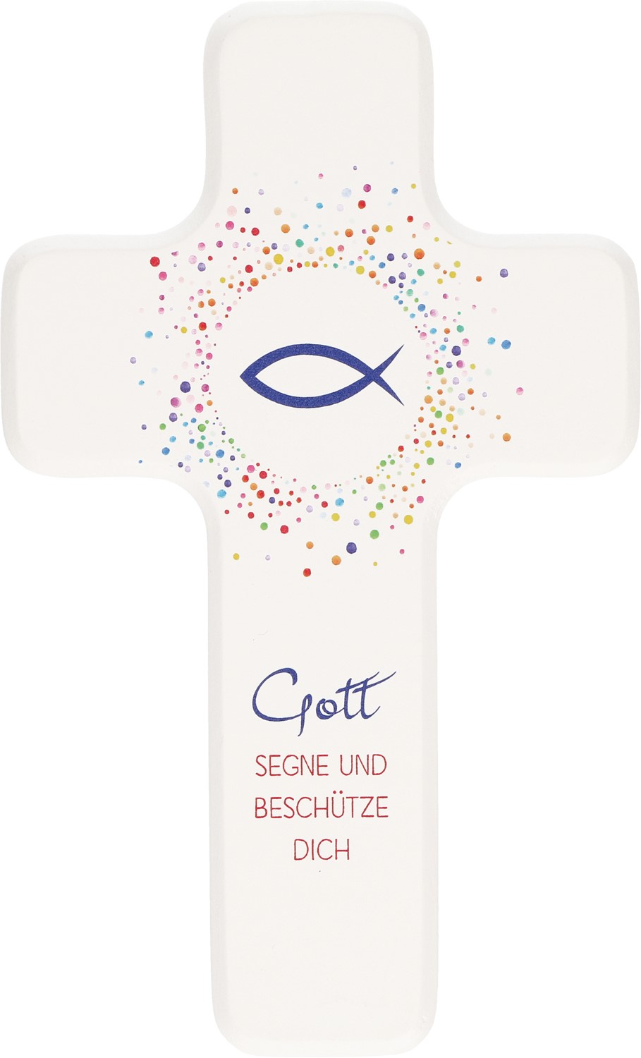 Kinderkreuz, Buche, weiß lackiert, farbig bedruckt, Höhe: 18 cm, an der Wand aufzuhängen
