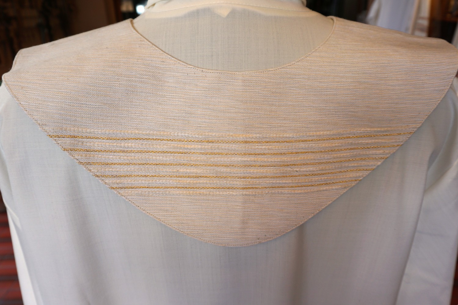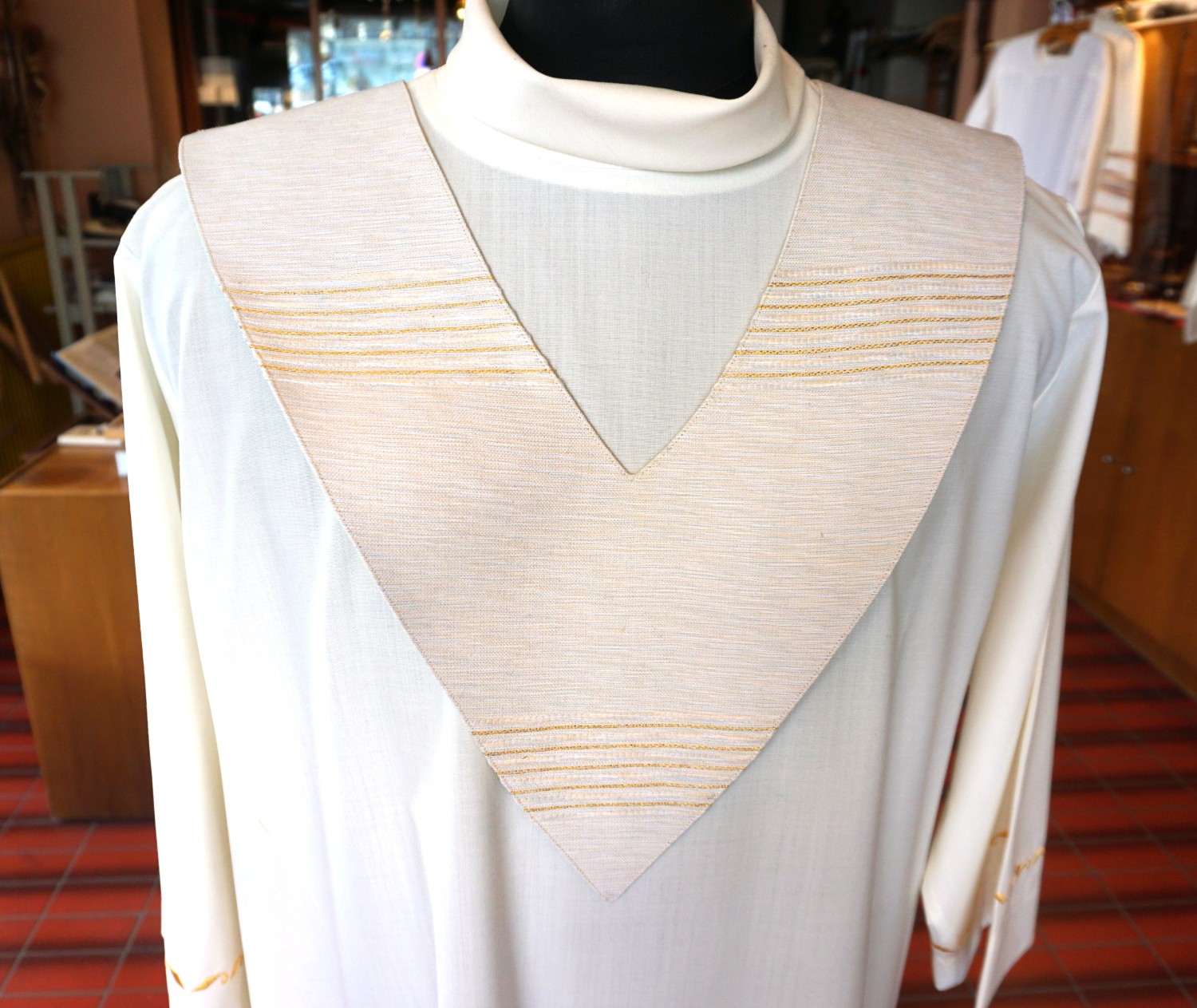 cremefarbener Kragen für Wortgottesdienstleiter und Leiterinnen. Goldlurexstreifen eingewoben. Futter: Baumwollsatin. Breite ca 12 cm.