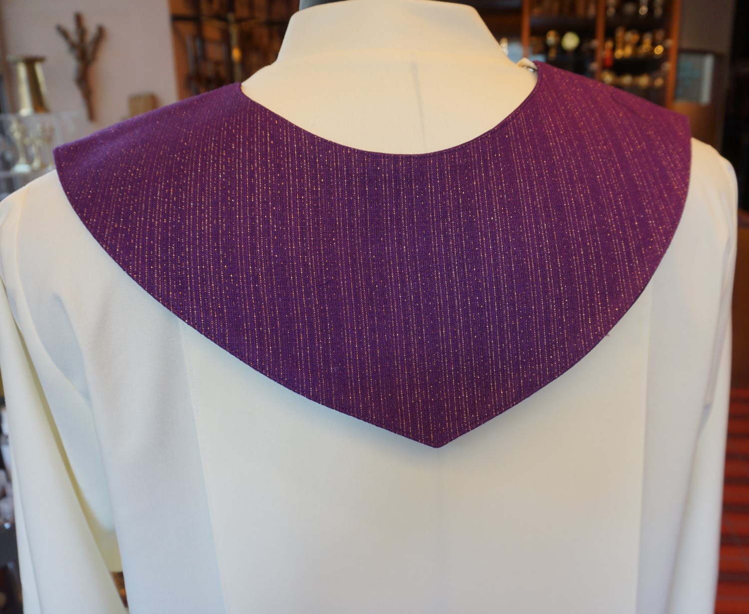 violetter Lektorenkragen mit feinen Goldlurexstreifen, gefüttert, wird über einer Alba angezogen, ist für Wortgottesdienstleiter, Lektoren etc. gedacht