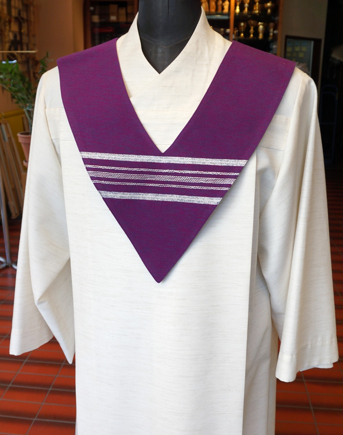 violetter Kragen für Wortgottesdienstleiterinnen und -leiter sowie Personen im Lektorendienst. Quergezogen befinden sich eingewobene Silberlurexfäden; gefüttert