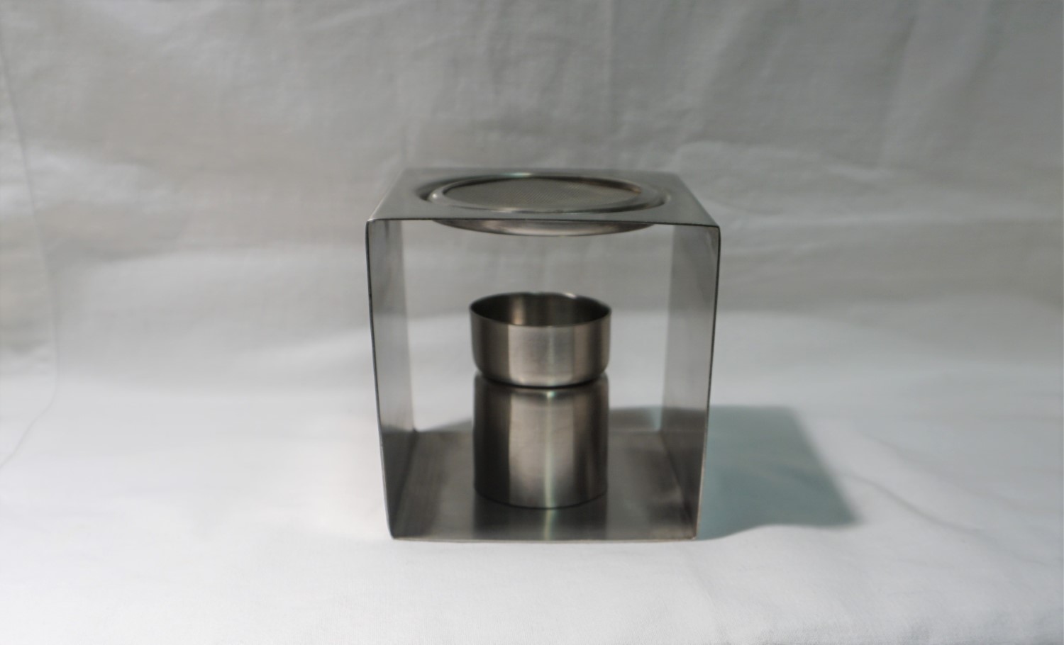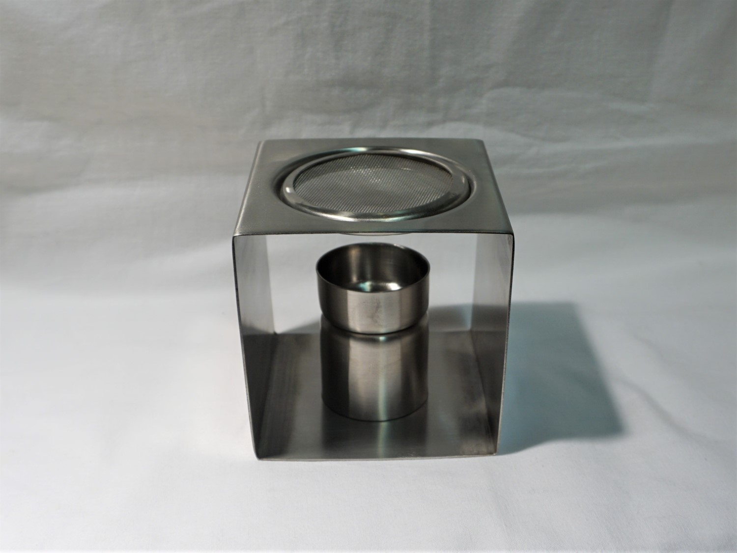 kleines Gerät aus Edelstahl. Das Erhitzen des Weihrauchs erfolgt durch eine unter dem Gitter befindliche Kerze. Der Weihrauch liegt auf dem Gitter. Abmessung: Breite, Tiefe und Höhe: je 9 cm