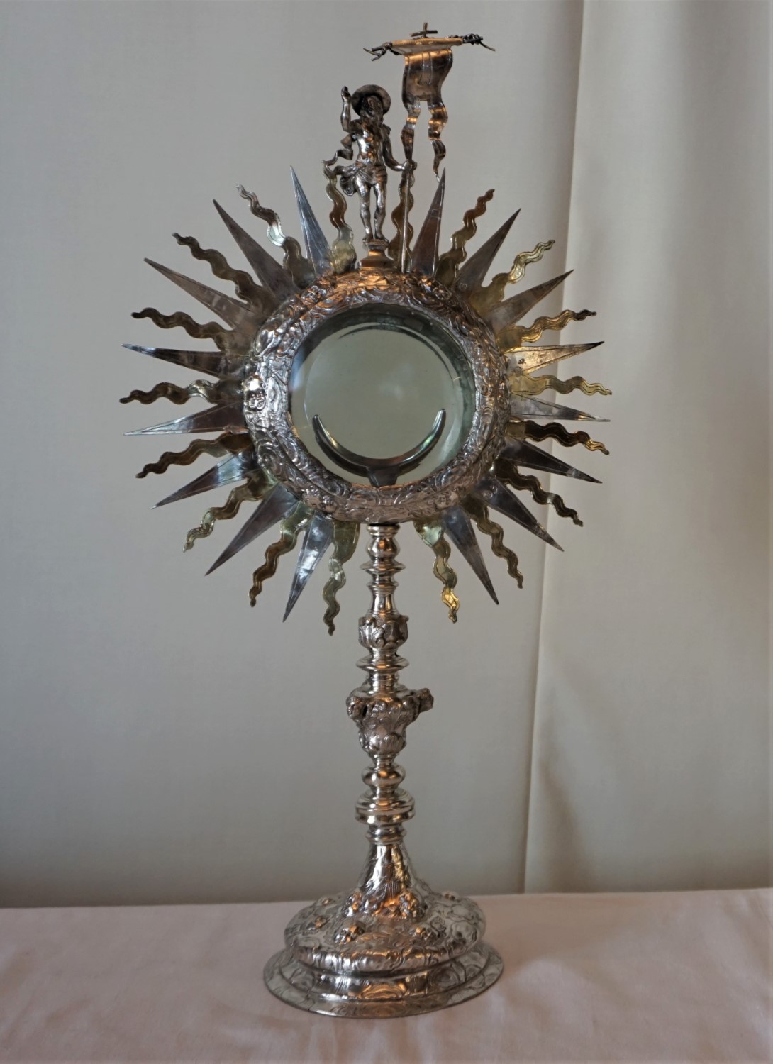 Bei dieser, wahrscheinlich aus der Barockzeit stammenden, Monstranz fehlte die Lunula. Diese wurde durch uns beschafft und wie gewünscht aussen versilbert und innen vergoldet gehalten. Der Schlitten wurde angepasst und der Griff zum Öffnen des Raumes, in dem sich die Lunula befindet, repariert, sodass jetzt die Monstranz wieder voll funktionsfähig ist.