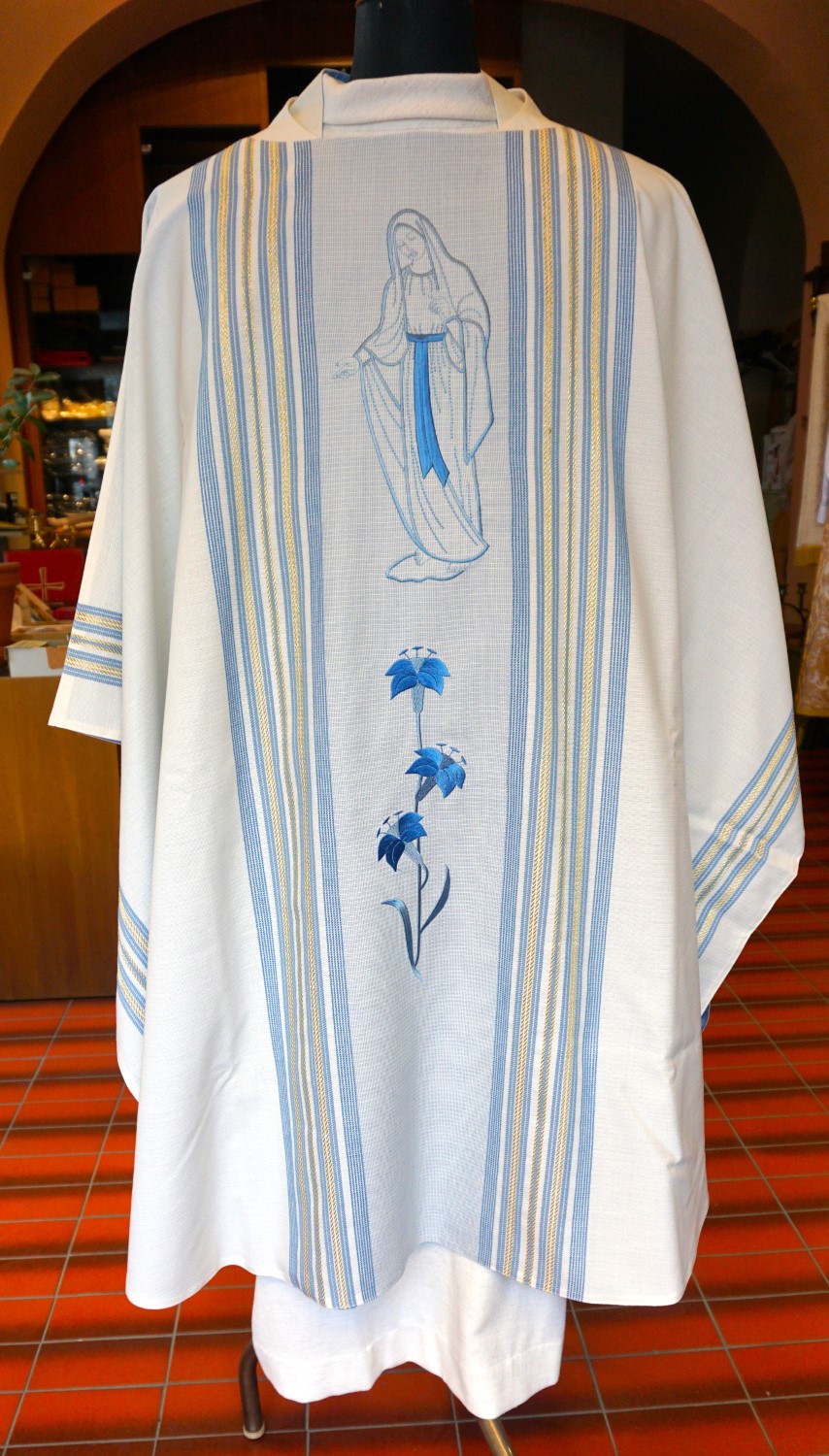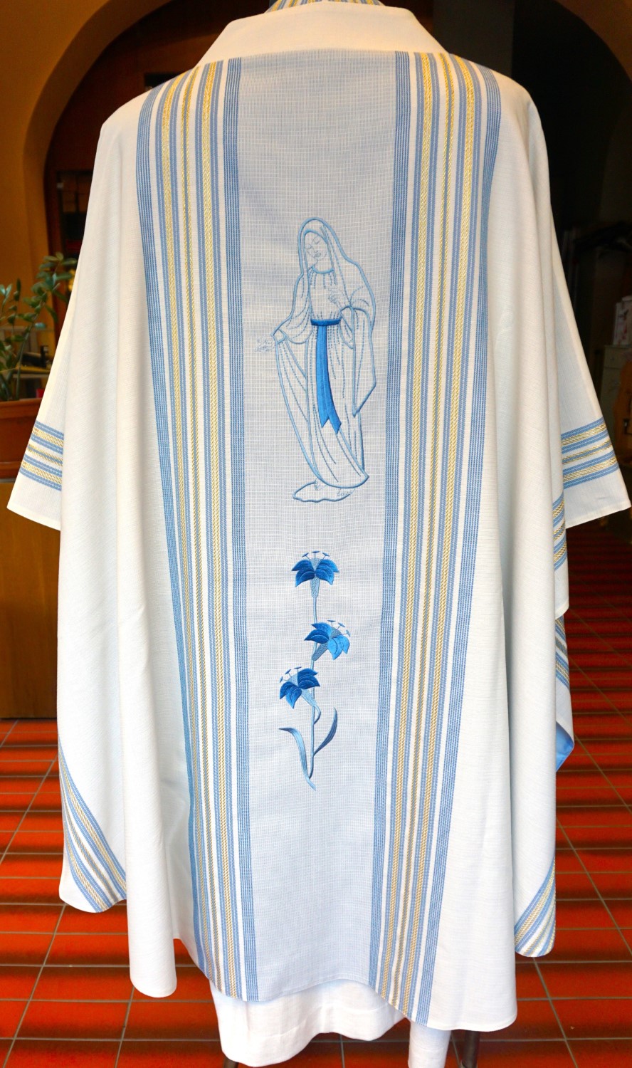 Kasel für Marienfeste, Stoff in gebrochenem Weiß mit blauen Längsstreifen und Steifen mit Goldlurexfaden. Auf der Vorder- wie auf der Rückenseite sind jeweils eine Gottesmutterdarstellung sowie Lilien, dies mit blauem Faden, eingestickt. Der Grundstoff ist ein Schurwolle Trevira Gemisch. Die Fütterung erfolgt mit blauer Seide.