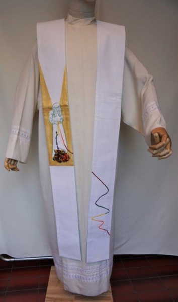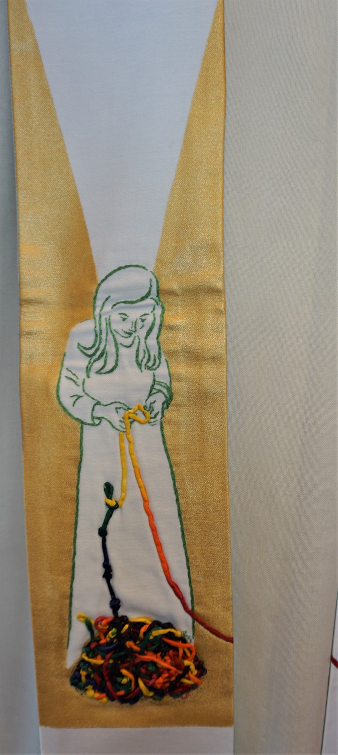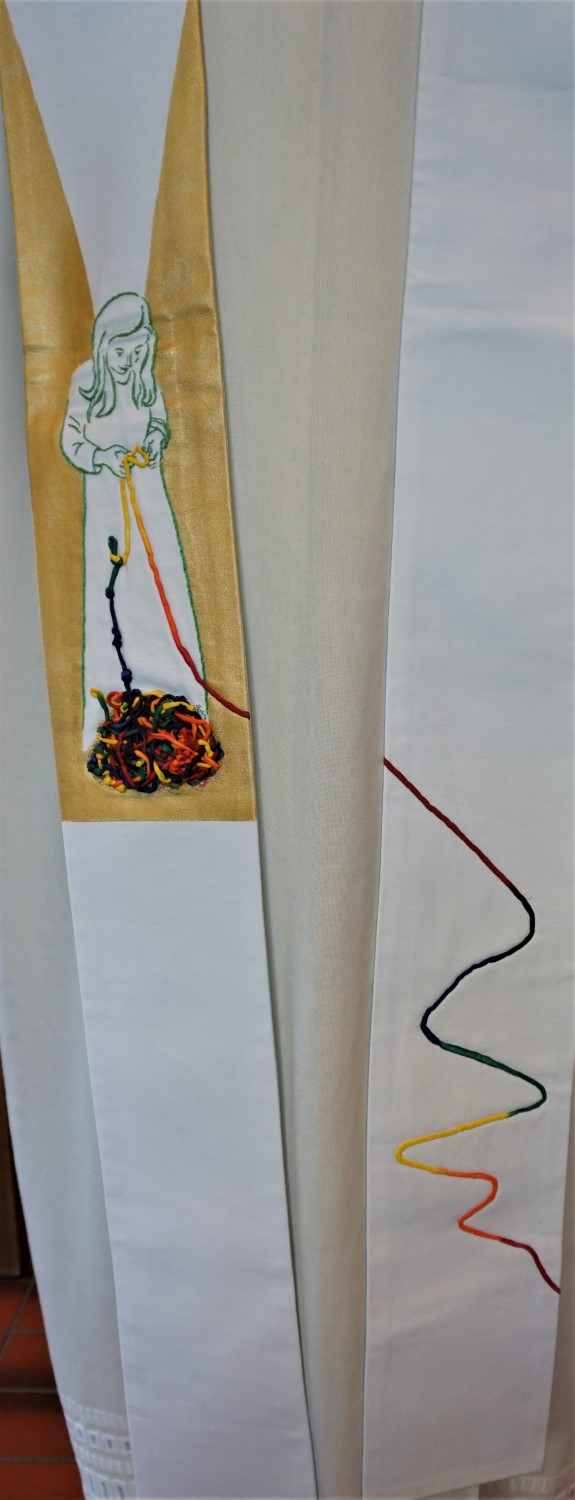 Marienstola mit dem Motiv "Die Knotenlöserin". Das Motiv ist mit der Hand gearbeitet, teilweise gemalt, teilweise auch gestickt