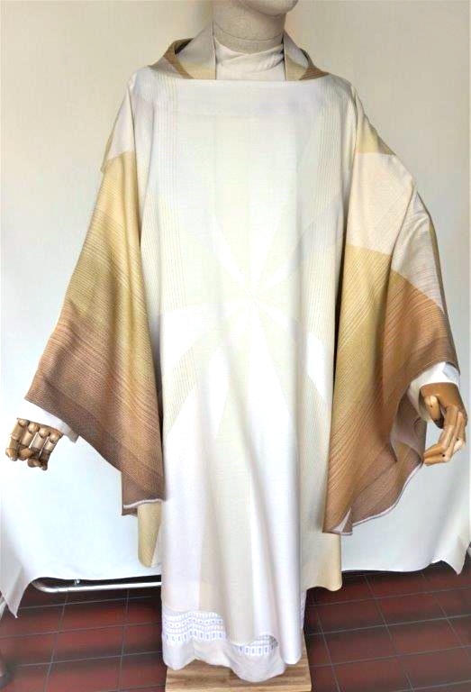 cremefarbene Kasel, ungefüttert, Stoff: Schurwolle/Trevira Gemisch, Symbol "Das Licht", Innenstola, Länge ca 133 cm, leichte Kasel