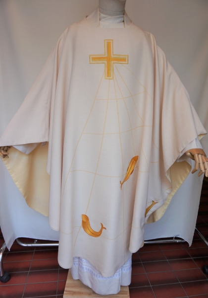cremefarbene Kasel, mit Baumwollsatin gefüttert, Innenstola, Stoff: Schurwolle/Trevira Gemisch, eingewobene Kreuz-, Fischer- und Fischsymbole auf Vorder- und Rückseite, sehr festliches Meßkleid