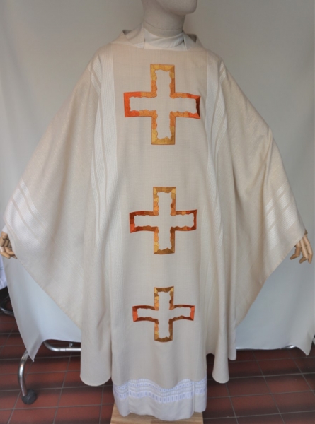 Kasel weiß, Kreuzfäden in Bronze, Gold und Rot