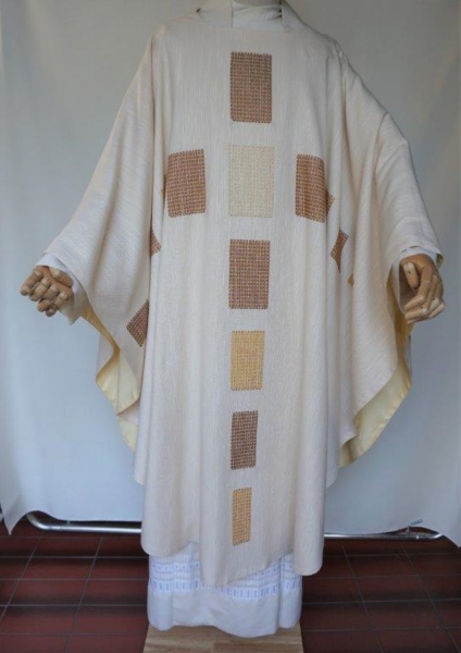 weiße/cremefarbene Messgewand, mit Seide gefüttert, moderne Kreuzsymbolik durch eingewobene verschiedenfarbige Rechtecke, Innenstola, Stoff: Schurwolle/Trevira Gemisch