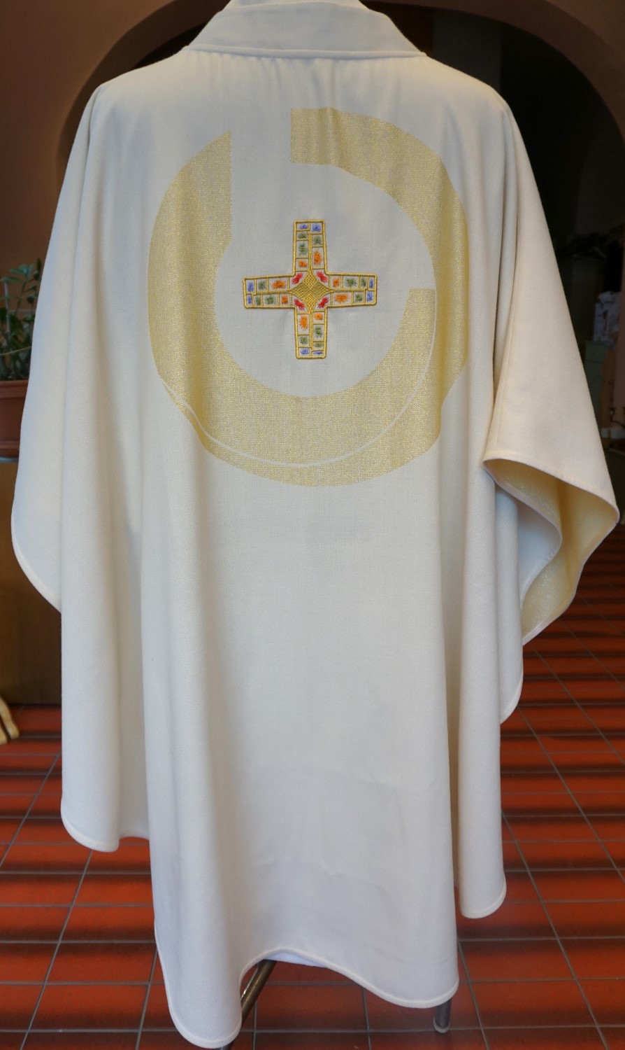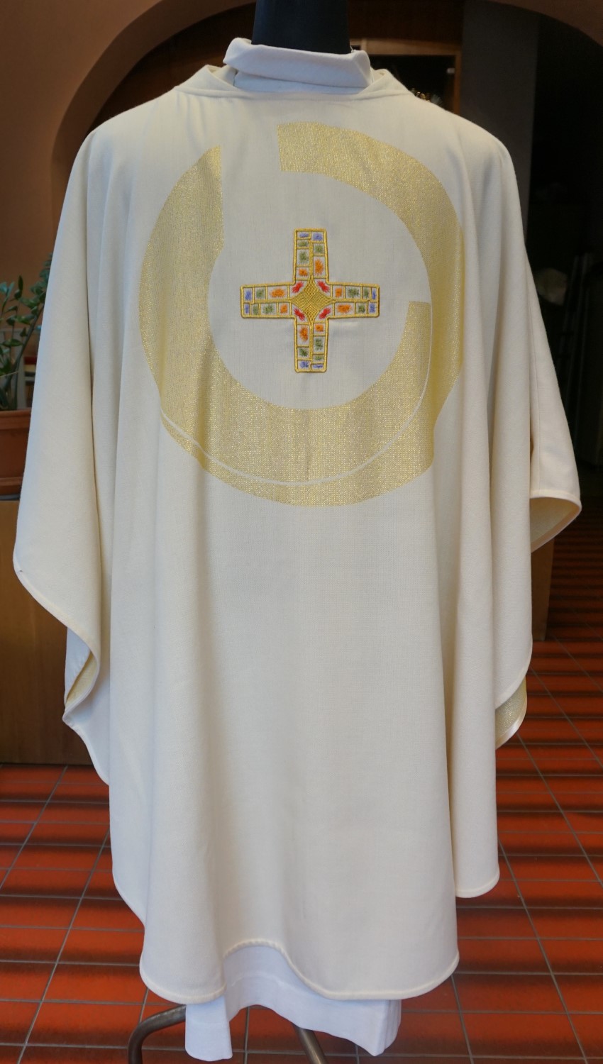 cremefarbenes Messgewand, ungefüttert, Stoff: Schurwolle/Trevira/Lurex Gemisch, buntes maschinegesticktes Kreuz durch Lichtbogen eingefaßt, Innenstola, Länge ca 133 cm