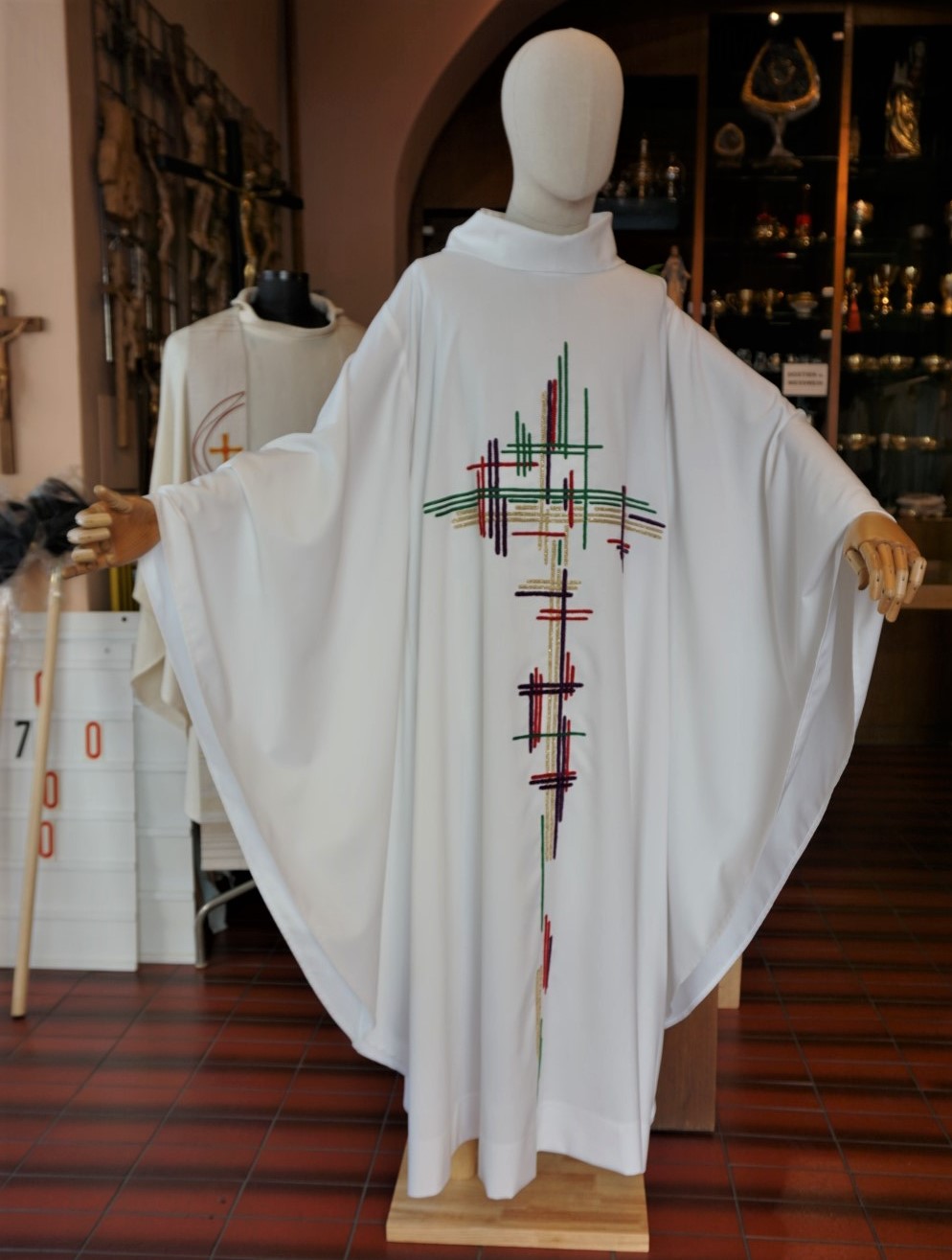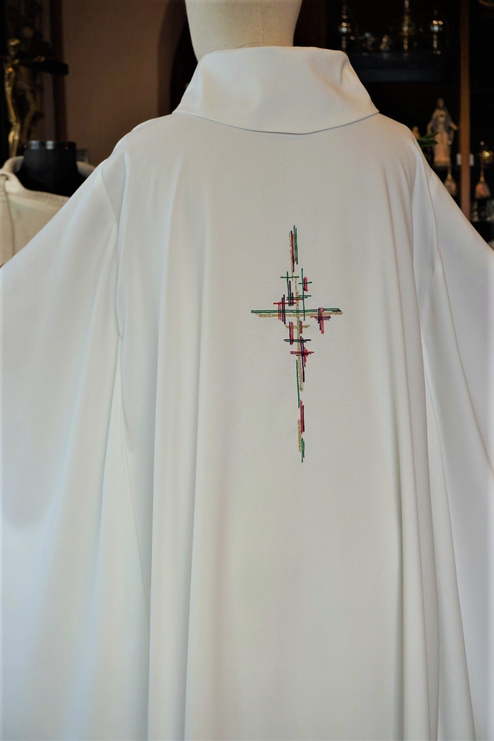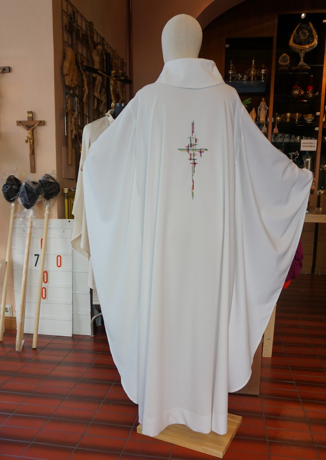 weißes Messgewand mit Schalkragen, modernes großes Kreuz mit Maschine eingestickt auf der Vorderseite, gleiches Kreuz, nur kleiner, auf der Rückenseite. Innenstola. Stoff: 33% Viscose, 66% Polyester. Bei Bestellung geben Sie bitte den Kopfumfang an.