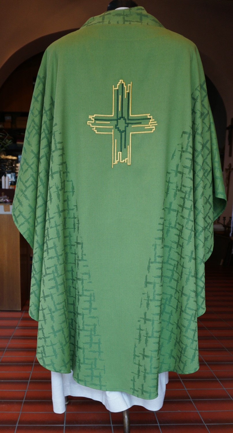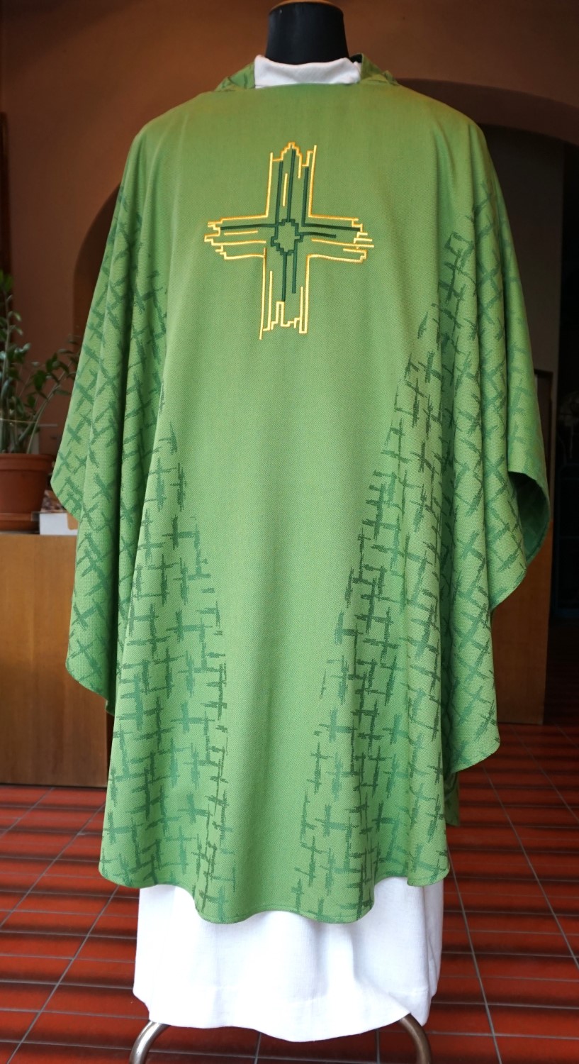 grünes Messkleid mit modernen eingewobenen Kreuzen in anderem Grünton. In der Mitte auf der Vorder- wie auch auf der Rückenseite ist ein Kreuzzeichen eingestickt. Stoff: Schurwolle/Trevira Gemisch, ungefüttert. Innenstola ist dabei.