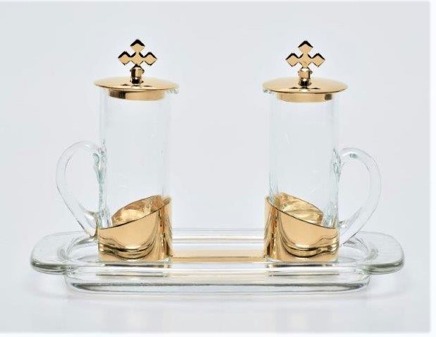Meßwein- und Wasserkännchen auf einem Glastablett (20 x 9,5 cm), Kännchen mit abnehmbarem Deckel, Känncheninhalt ca 100 cc