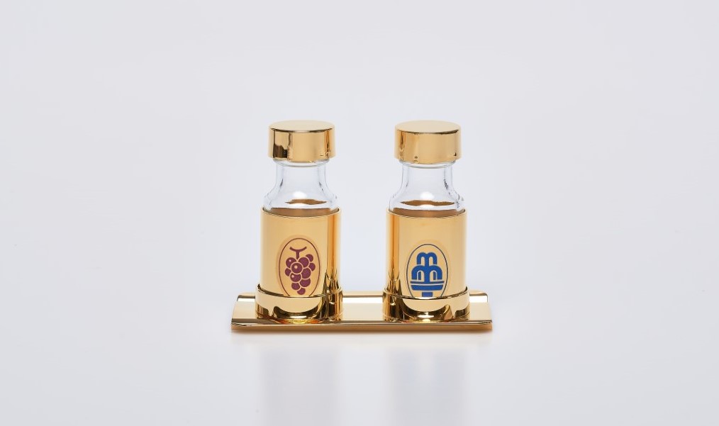 Garnitur mit Fläschen in einer auf einem Tablett angebrachten Halterung, Messing vergoldet, Wein- und Wasserkennzeichnung, Fläschcheninhalt: je 30 cc, Schraubverschlüsse, Maße: 11 x 6 cm