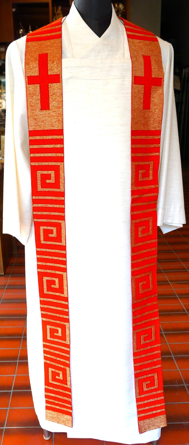 Priesteraussenstola mit rotem und Goldlurexfaden gewoben, moderne Gestaltung, Kreuze eingewoben, mit Baumwollsatin gefüttert