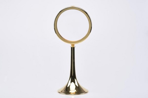 einfache Monstranz (Quetschmonstranz), Messing vergoldet, Höhe: 40 cm, Durchmesser: 16 cm, Öffnung klappbar, runder Fuß