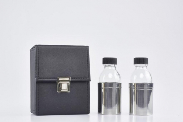 2 Ölgefäße in Fläschchenform in einem Kunstlederetui, Inhalt je Fläschchen 125 cc, Maße des Etuis: 14 x 11 x 6 cm. Bitte definieren Sie bei der Bestellung, welche Hl. Öle Bezeichnung die Fläschchen tragen sollen.