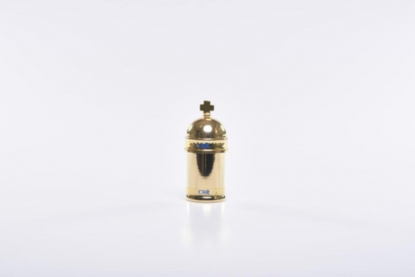 Ölgefäß mit Glaseinsatz, Maße: 3,5 x 8 cm, Schraubverschluss. Bitte definieren Sie bei der Bestellung für welches Hl. Öl das gefäß sein soll.