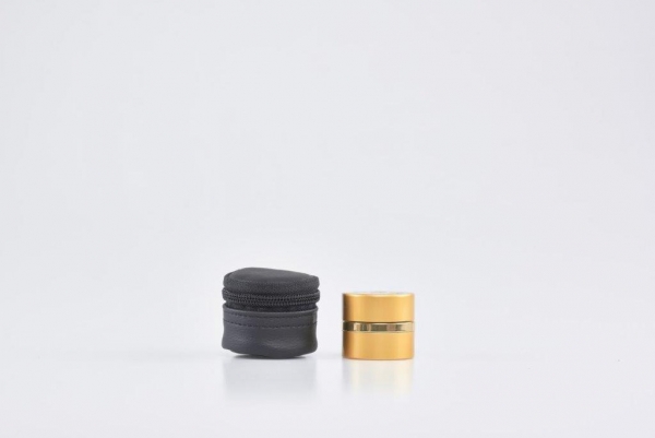 Ölgefäß in Kunstlederetui, Material: Aluminium vergoldet, mit Einsatz, Dimension: 6 x 5 cm, Einzelgefäßdurchmesser: 4 cm