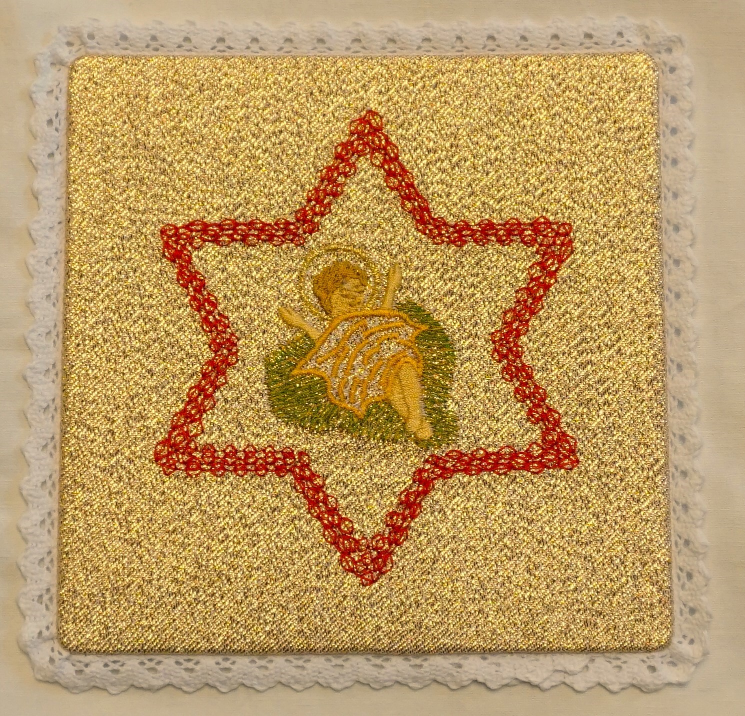 Palla: 17 x 17 cm, Goldfadenstoff mit Motiv Jesuskind in der Krippe, von sternförmiger Bestickung umgeben. Die Palla ist durch eine Baumwollspitze eingefaßt.