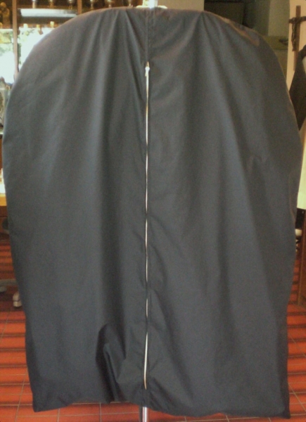 weite Hülle für alle Meßkleider, Zippverschluß vorne, oben Durchlass für Bügelhaken, auf der Unterseite Schlaufe um die untere Hälfte des Sackes nach oben klappen zu können und im Haken einzuhängen. Das erleichtert den Transport. Material: Kunststoff, daher wasserabweisend. Dieser Sack wird händisch genäht. Die Farben des Sackes sind jeweils dunkel gehalten.