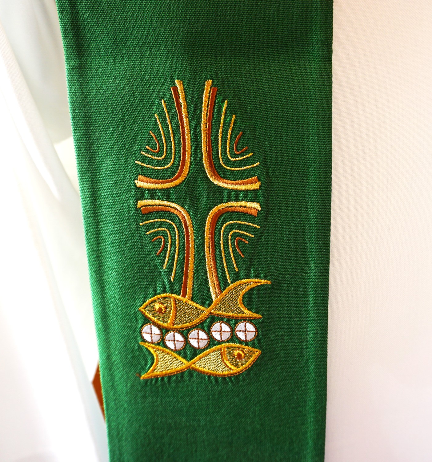 grüne Aussenstola für Priester, Querstreifen auch mit Lurexfäden eingewoben. Die Stola ist gefüttert. Symbole Fisch, Brot und Kreuz sind mit der Maschine eingestickt.