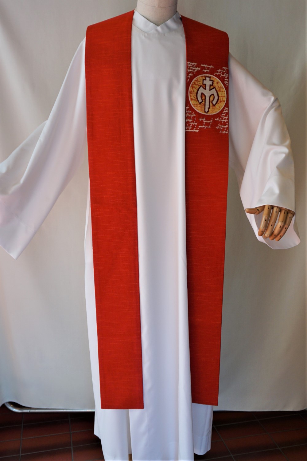 rote Priesterstola mit in Handarbeit gefertigtem Marienzeichen. Wolle/Trevira Gemisch, Futter aus Baumwollsatin. Die Stola ist ganz wenig gebraucht.