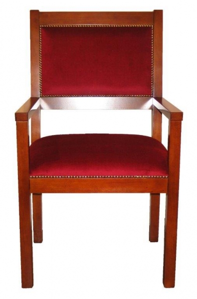 Stuhl mit Armlehne, nußfarben, gepostert, mit Samt überogen, Höhe über Lehne: 103 cm, Sitzhöhe: 50 cm, Stuhltiefe: 50 cm, Stuhlbreite: 57 cm.