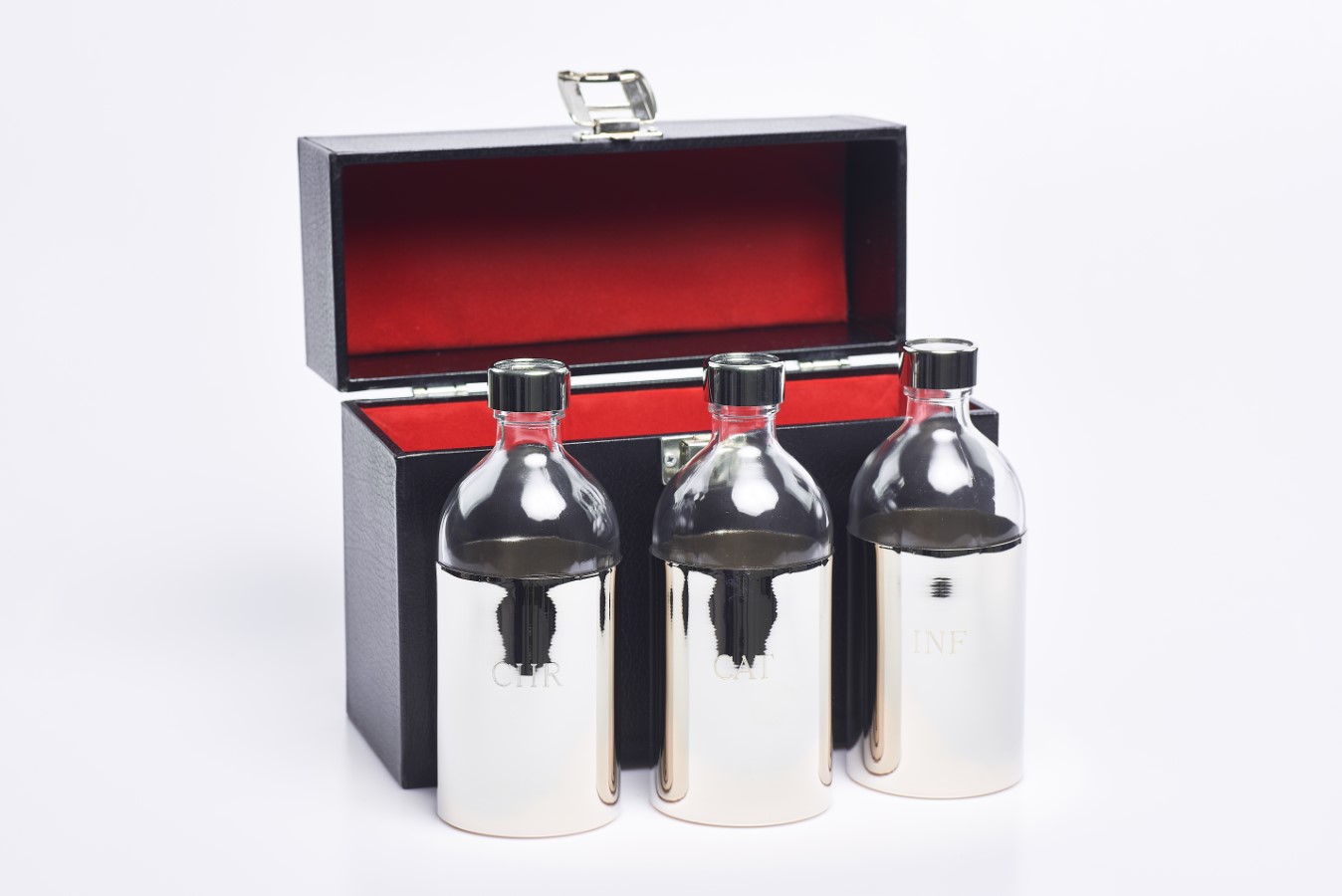 Die drei verschiedenen Hl. Öle in entsprechend gekennzeichneten Glasgefäßen in Aluminiummantel, Inhalt je 500 cc, Schraubverschluß, inklusive passendem Etui