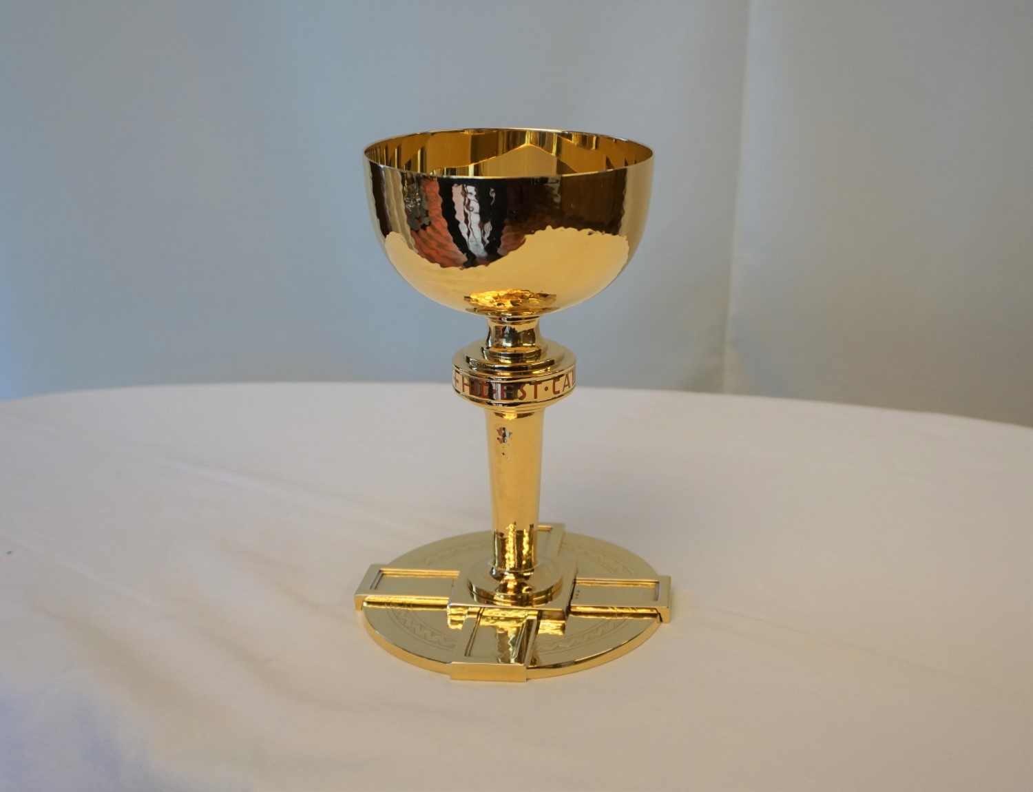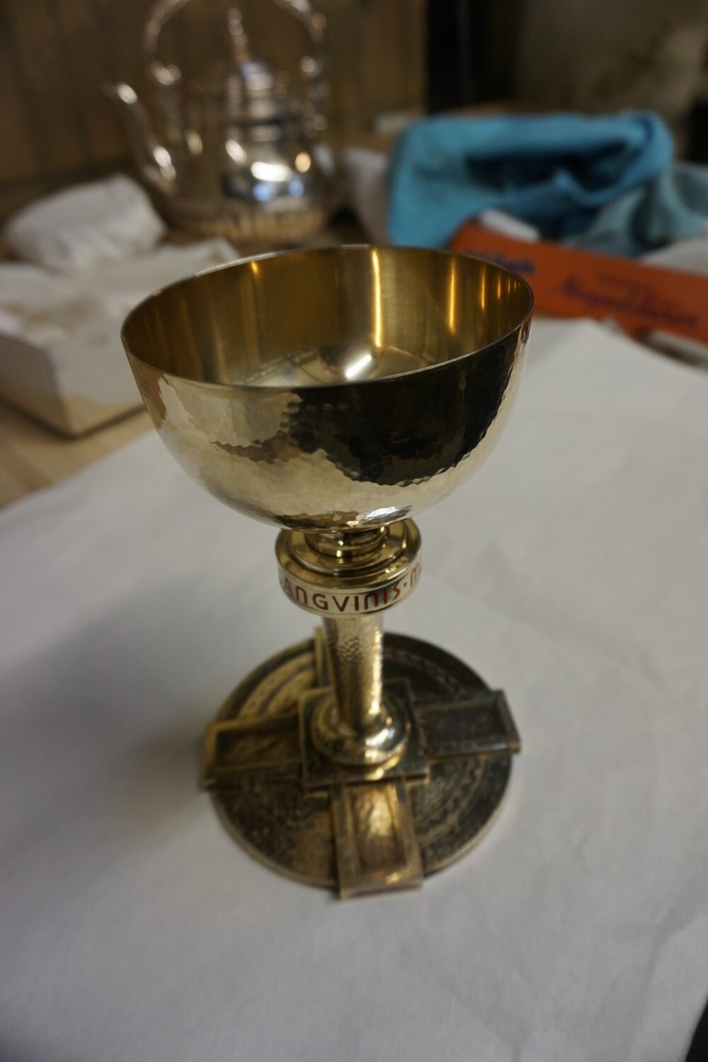 Dieser Kelch hat nach vielen Jahren seine ursprüngliche Goldschichte verloren. Daher war eine allgemeine Reinigung und eine Neuvergoldung notwendig. Jetzt kommt auch die Inschrift am Nodus aber auch die Hämmerarbeit wieder deutlich zum Ausdruck. Sie sehen Bilder von vor der Bearbeitung und danach.