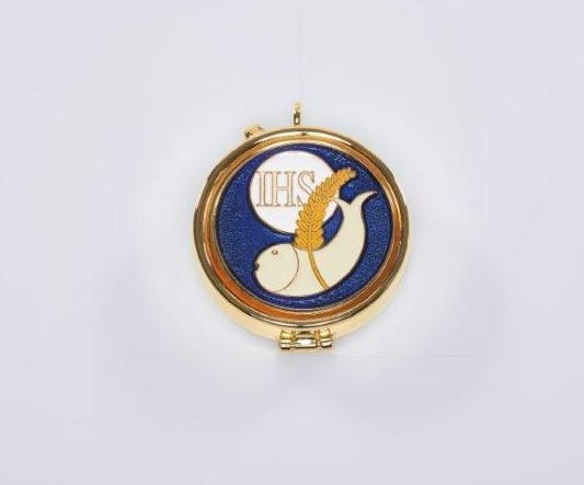 Hostiendose, vergoldet, Symbolfläche aus Kunststoff, Symbol: Fisch, Palmzweig und Hostie, mit Klappverschluß,