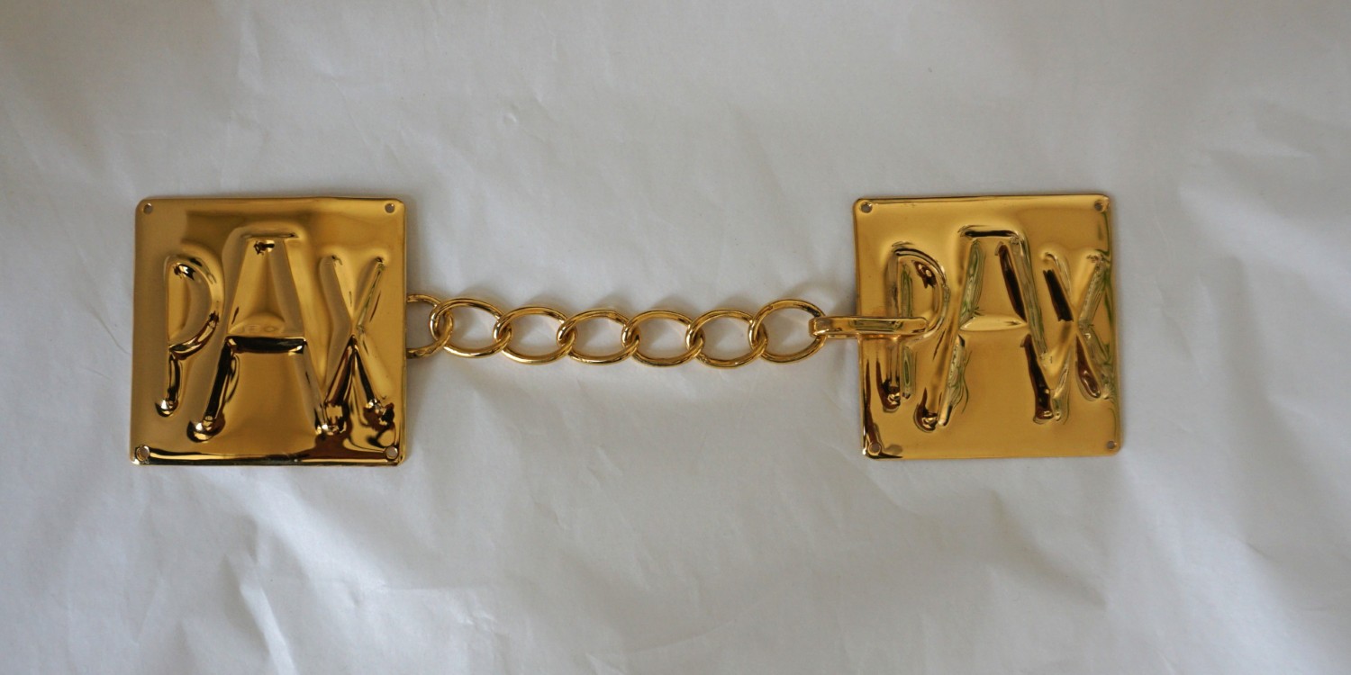 quadratische Plättchen jeweils mit dem PAX Zeichen versehen. Messing vergoldet. Maß: 5 x 5 cm. jeweils 4 Nähpunkte, starke Kette