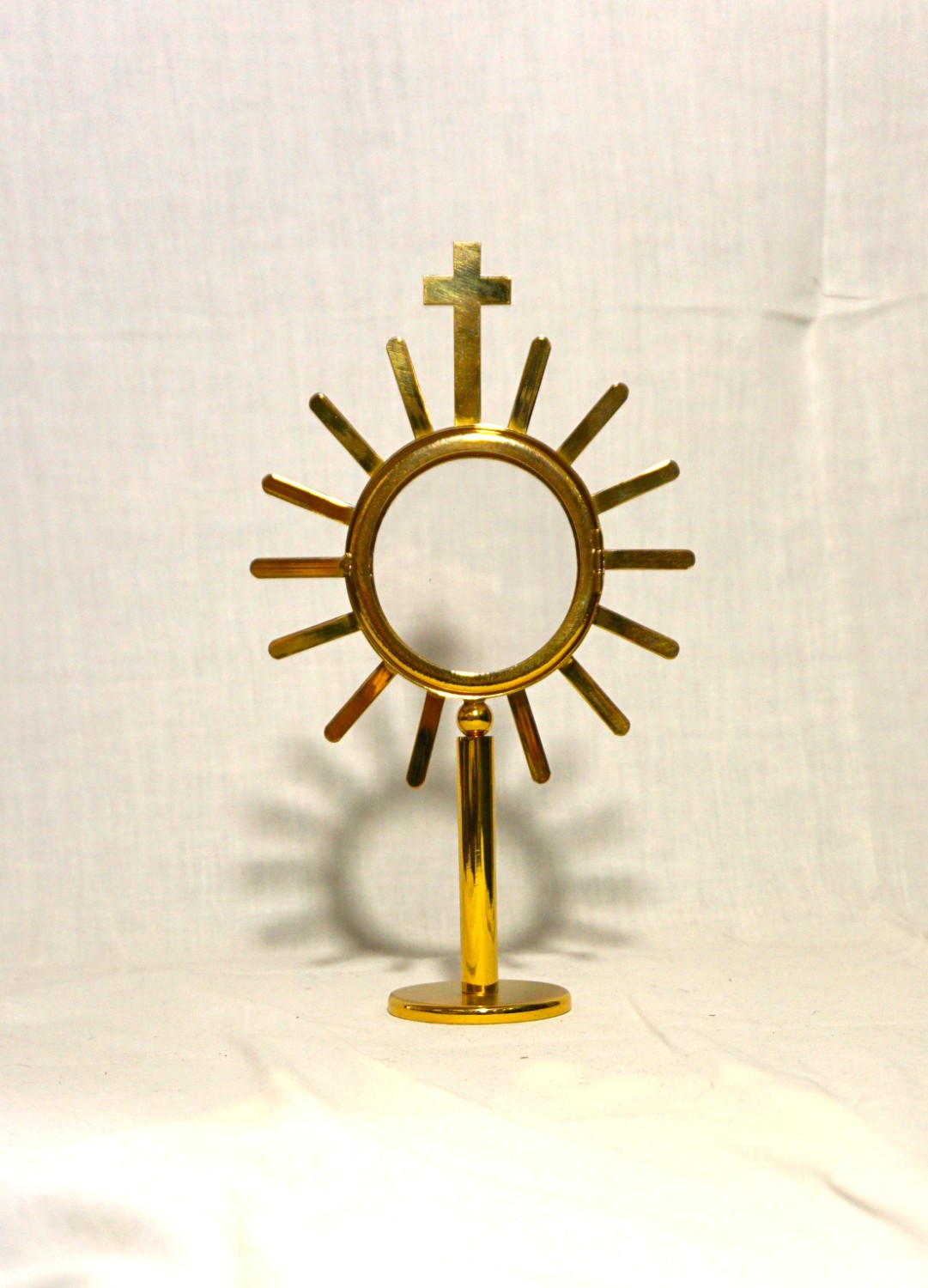 Messing, vergoldet, aufklappbar, Quetschmonstranz. Gesamthöhe: 23 cm, Breite mit Srahlen: 14 cm, faßt eine Monstranz mit Durchmesser 7 cm.