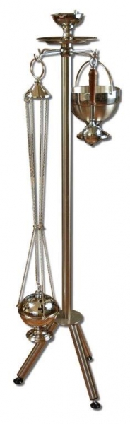 Rauchfasständer aus Edelstahl, Höhe 130 cm, mit 4 Haken zum Einhängen von Gerät und 1 Ablagefläche oben. Dreiteiliger Fuß, wobei die einzelnen Fußlängen durch Verstellschrauben den Bodengegebenheiten entsprechend eingestellt werden können. Der Preis versteht sich ohne Rauchfass, Weihwasserkessel und Schiffchen