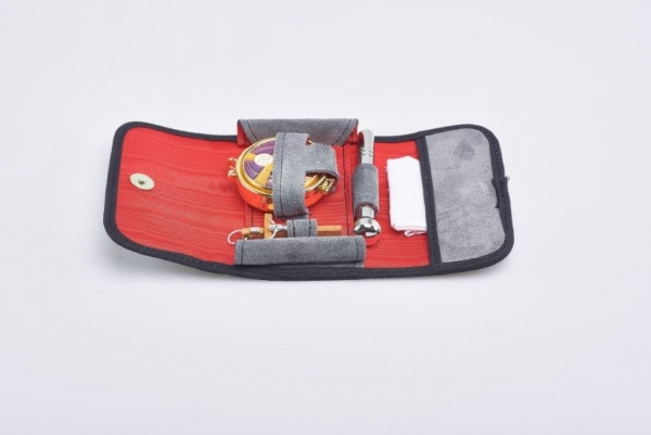 Versehetui aus grauem Kunstrauleder, Abmessung: 9 x 12 x 3 cm, Inhalt: Hostiendose, Kreuz, Aspergill, Corporale, Druckknopfverschluß